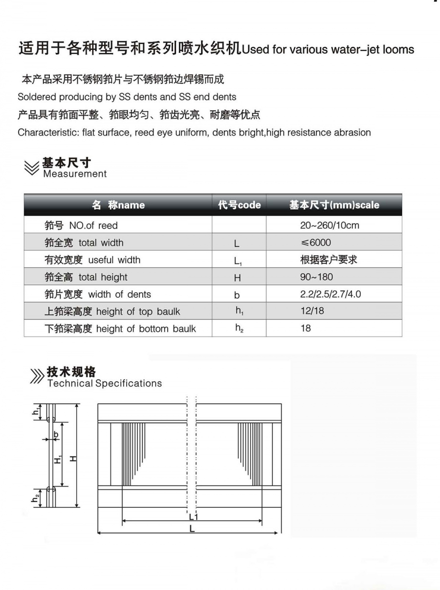 Product description:適用于各種型號和系列的噴水織機用鋼筘,本產品采用不銹鋼筘片與不銹鋼筘邊粘接而成,產品具有筘面平整、筘眼均勻、筘齒光亮、耐磨等優點